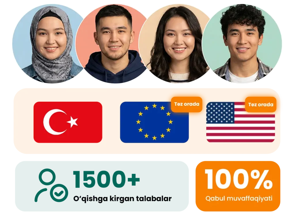Yo'nalish va universitet tanlashdan boshlab, qabul va ro'yxatdan o'tishgacha to'liq yordam beramiz